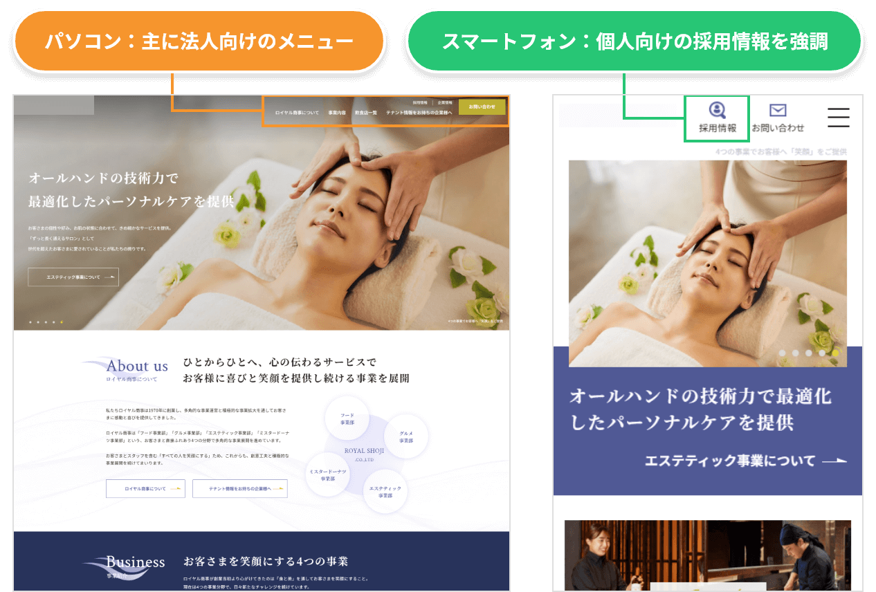 たとえば、法人からの閲覧が多く想定されるパソコンでは、法人向けのコンテンツをヘッダーに固定表示させ、個人ユーザーからの閲覧が多く想定されるスマートフォンでは、採用などの個人ユーザー向けのコンテンツをヘッダーに固定表示させるなど、フルオーダーメイドだからこそできるハイクオリティな設計を施しています。