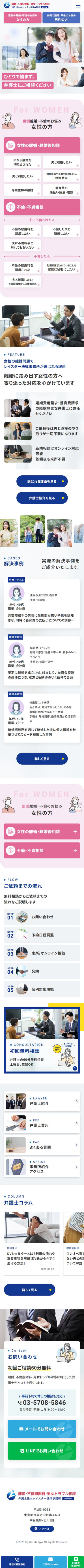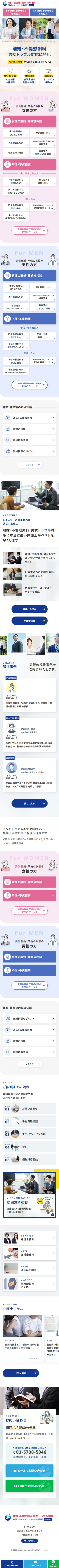 今回、リニューアルの主要な目的として、「新規顧客を増やしたい」というご要望をいただきました。そのため、メインビジュアル直下に「妻側離婚・不倫のお悩み 女性の方」「夫側離婚・不倫のお悩み 男性の方」という男女別のナビゲーションコンテンツを配置し、訪れたユーザーが必要な情報へスムーズにアクセスできる導線設計を実現しています。